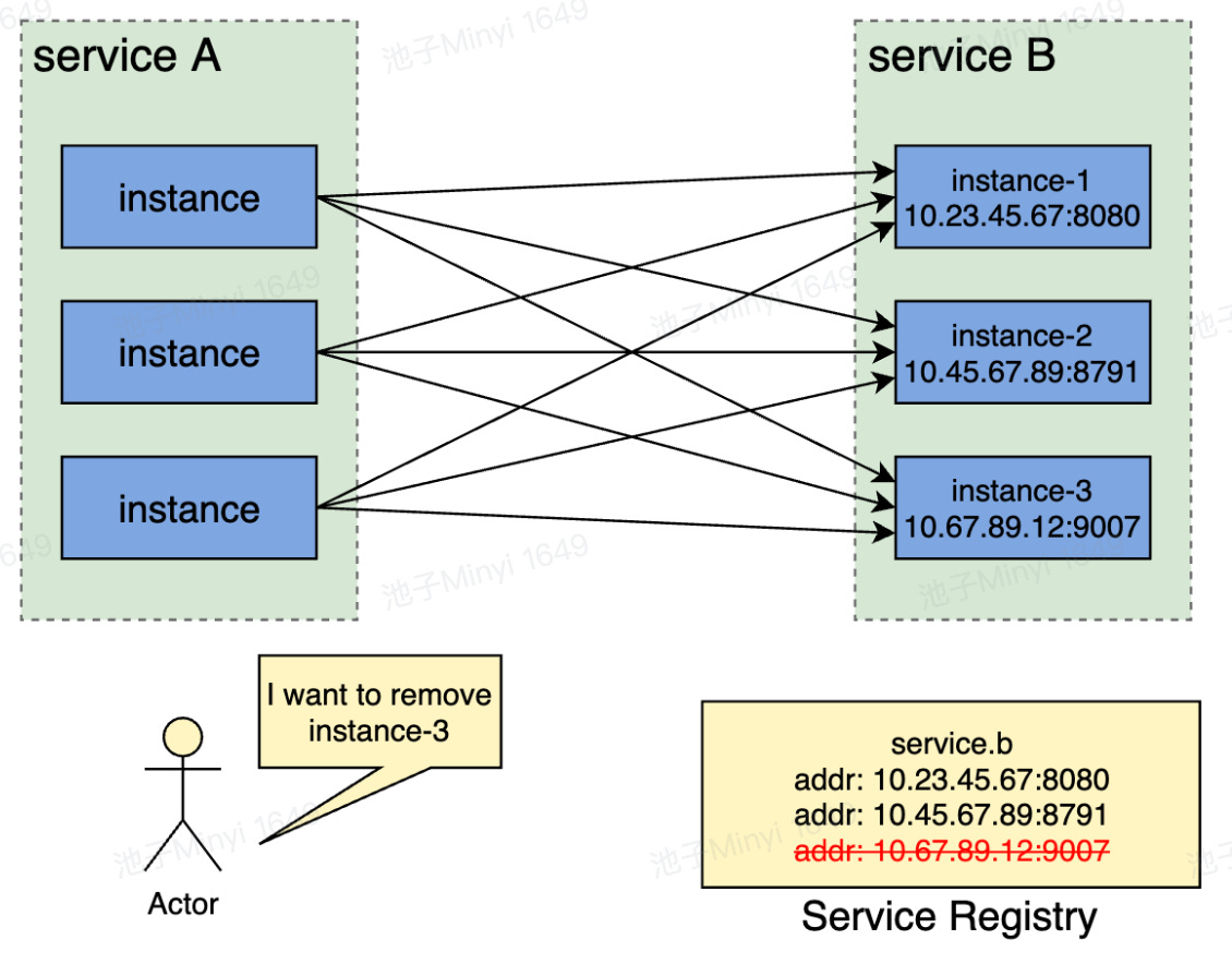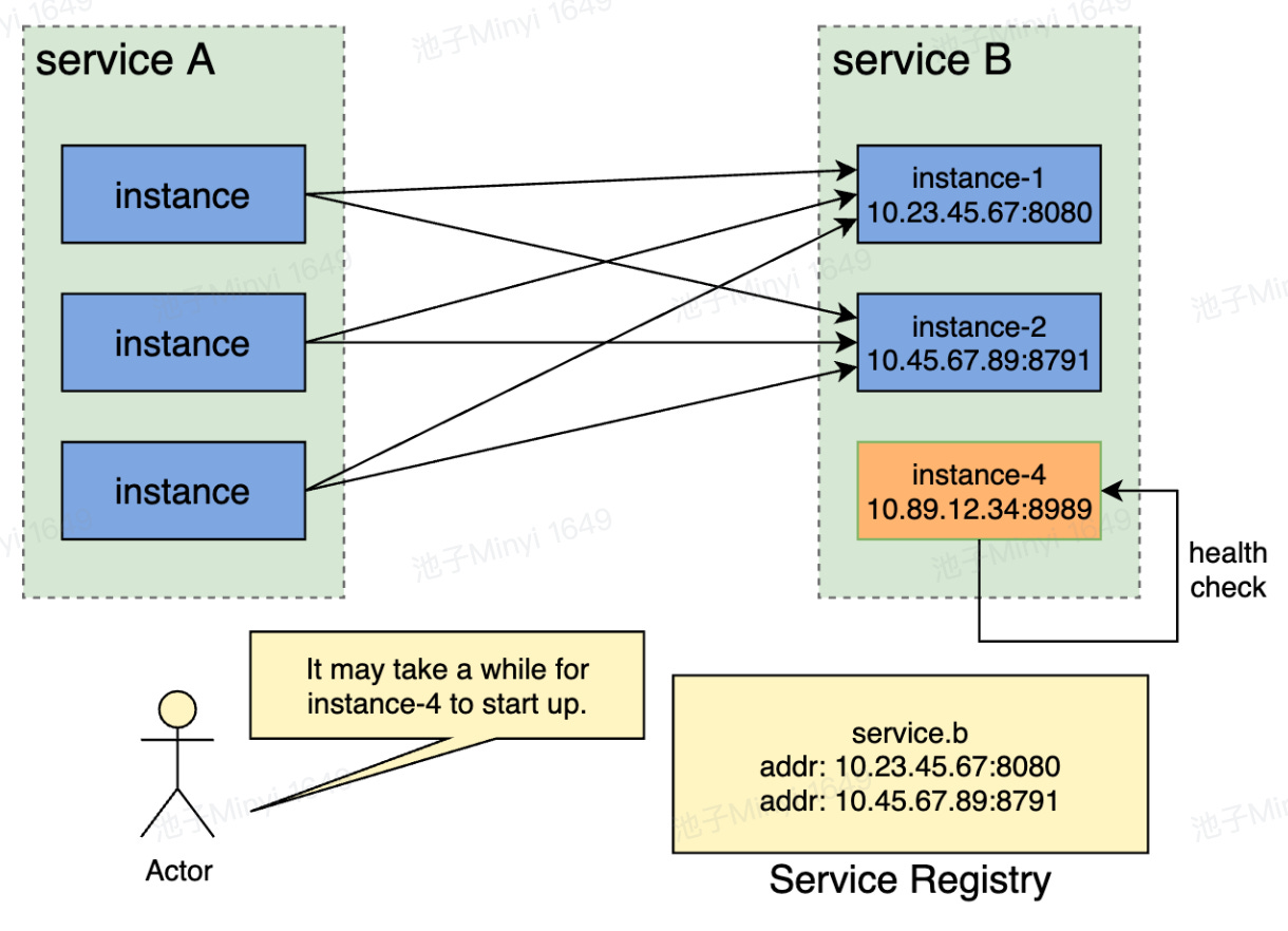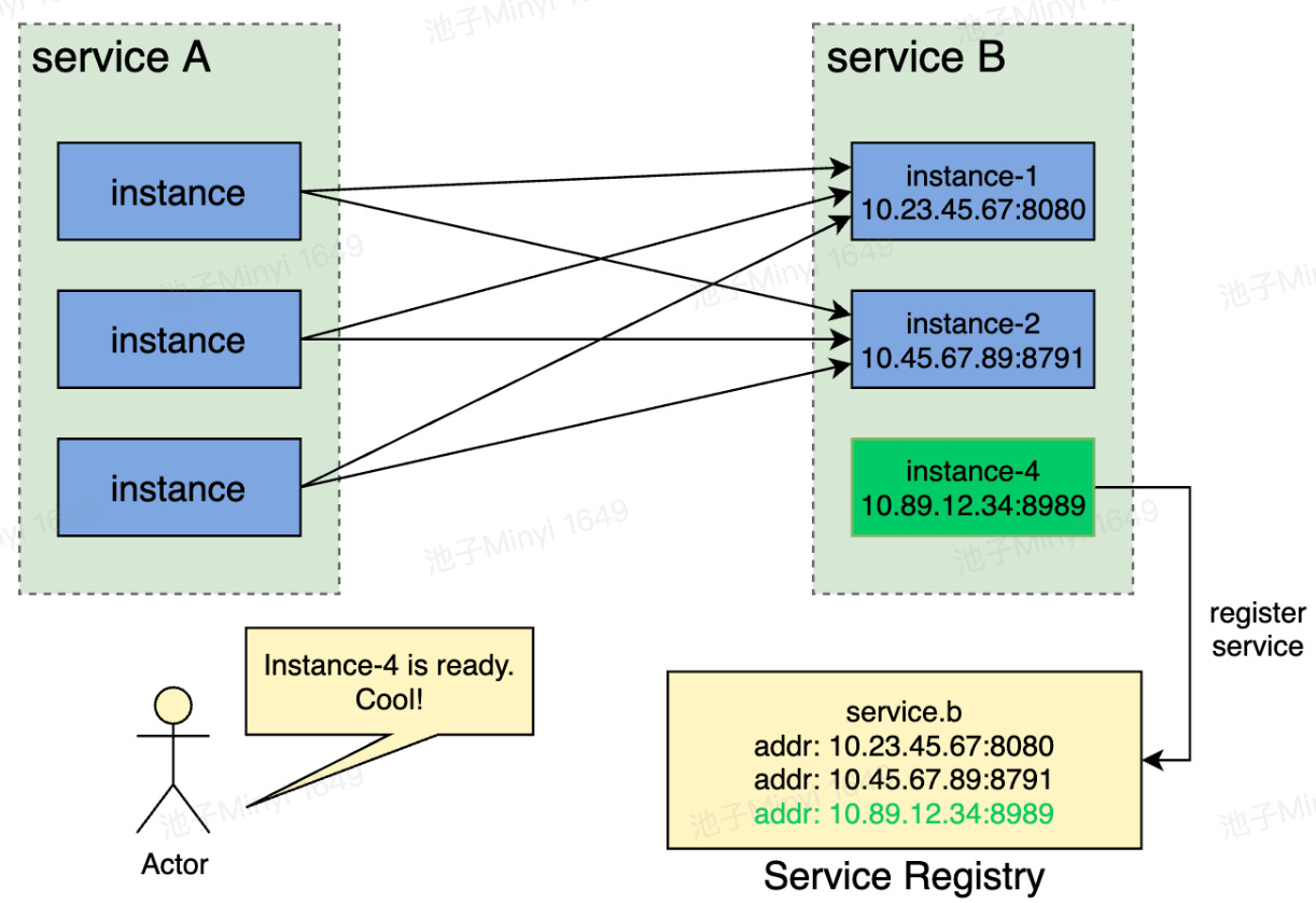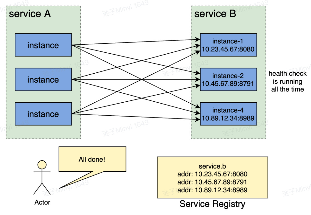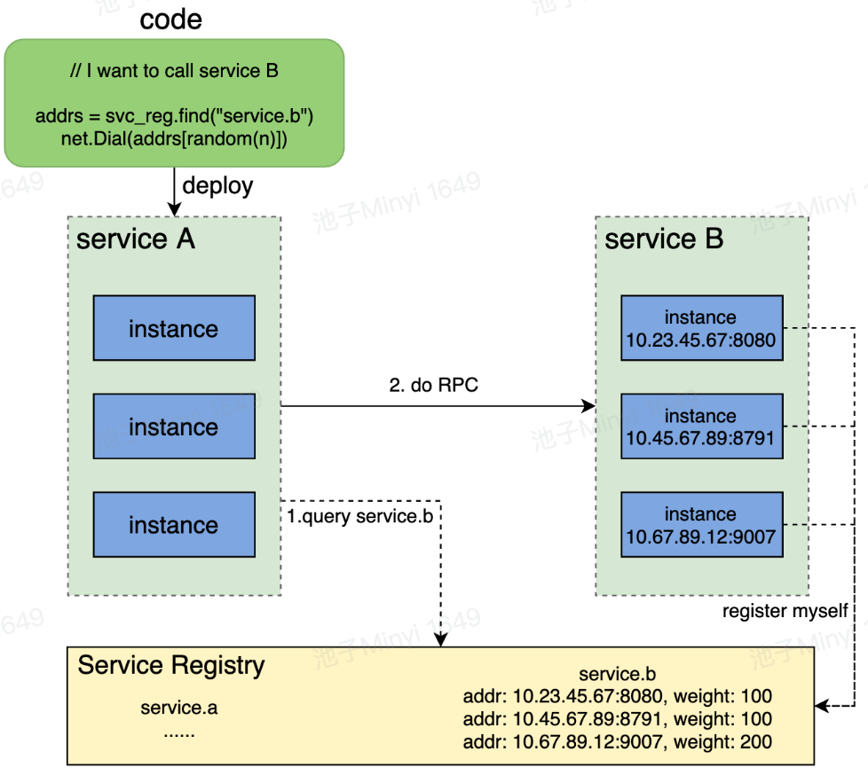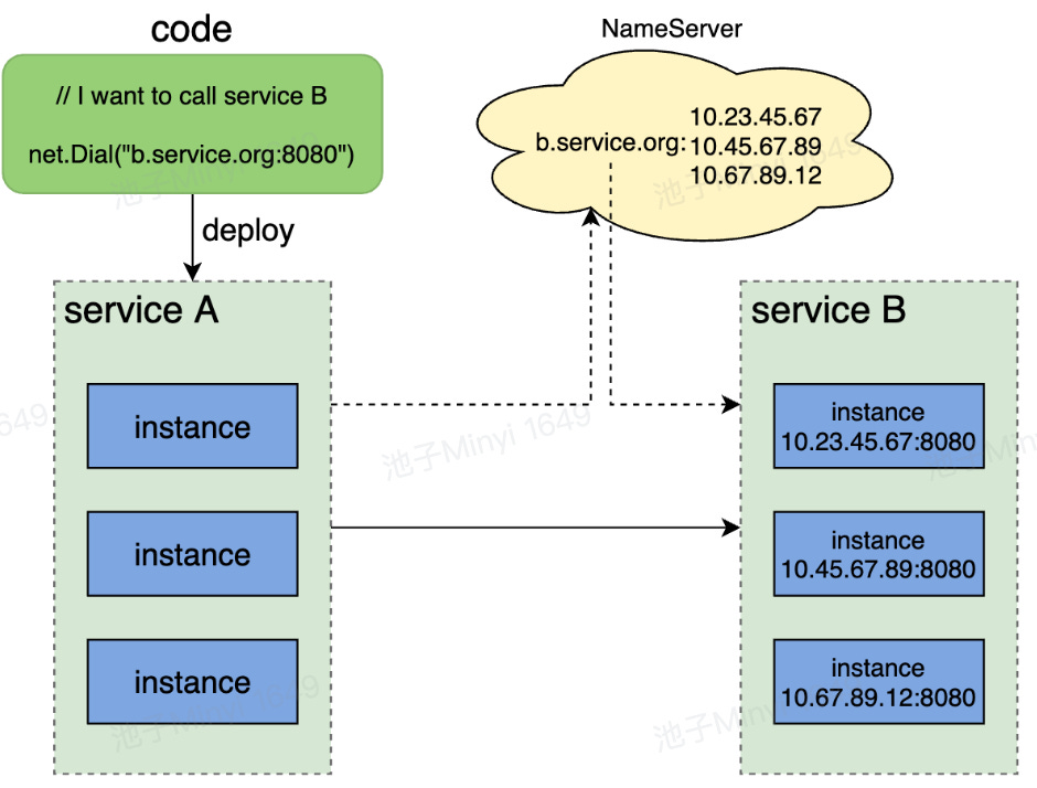 When service A needs to communicate with service B, using a hardcoded IP address and port number is not an ideal approach (as service B could have multiple IP addresses). Instead, you might want to consider using a NameServer. However, there could be issues if the instance in Service B becomes unavailable.